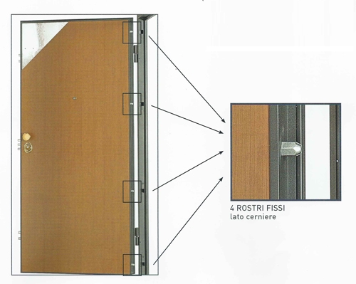 Porta blindata classe 3abbattimento acustico 34 dbtransmitanza termica 1,7 w/m2 kcilindro europeo con 5 chiavi + chiave cantiereapertura controllatagruppo serratura con 3 chiavistelli + mezzo girocerniere registrabilipunti di chiusura n. 8vasta gamma pannelli laccati e finitura legno{gallery}catalogo/porte-blindate{/gallery}